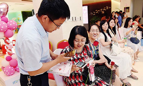 活动中,默契大考验、心有灵犀一线牵、缘分不打折等互动游戏,拉近了青年职工之间的距离。图为青年男女互加微信。本报记者刘强摄找“另一半”。