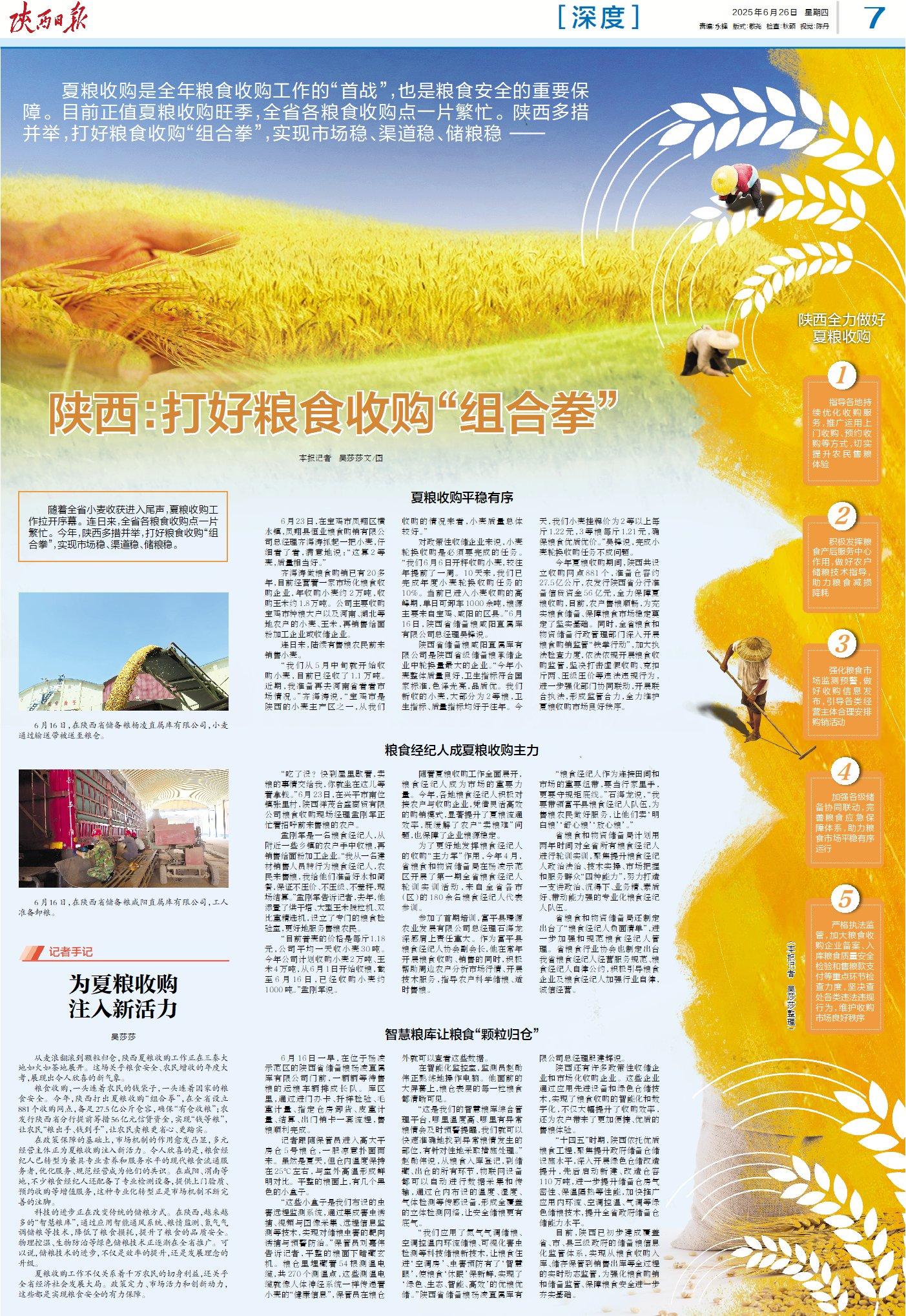 在政策保障的基础上,市场机制的作用愈发凸显,多元经营主体正为夏粮收购注入新活力。令人欣喜的是,粮食经纪人已转型为兼具专业素养和服务水平的现代粮食流通服务者,优化服务、规范经营成为他们的共识。在咸阳、渭南等地,不少粮食经纪人还配备了专业检测设备,提供上门验质、预约收购等增值服务,这种专业化转型正是市场机制不断完善的注脚。