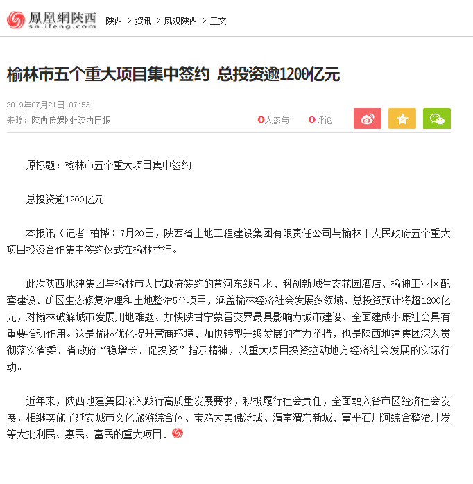 【凤凰网】榆林市五个重大项目集中签约 总投资逾1200亿元